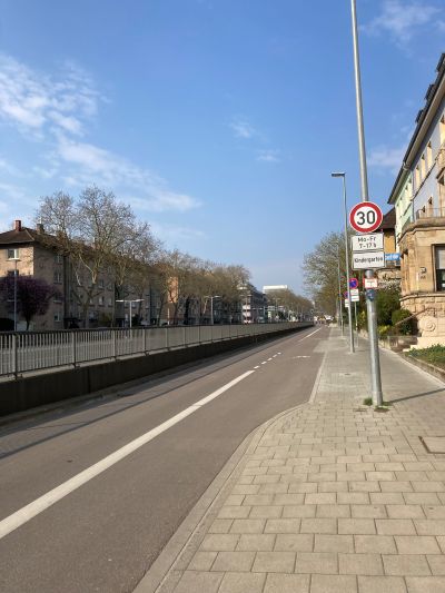 Die Kriegsstraße ist eine zentrale West-Ost-Verbindung südlich von Kaiserallee und -straße. Im Westen beginnt die Straße an der Kreuzung mit der Südtangente, südwestlich führt die Zeppelinstraße weiter. Zwischen der Straßenbahnhaltestelle „Kühler Krug“ und dem Weinbrennerplatz verlaufen auf der Fahrbahn ebenfalls Schienen der Straßenbahn, die hier in den Richtungsfahrbahnen aufgeteilt ist, zwischen denen eine Baumreihe mit schrägparkenden Autos verläuft.